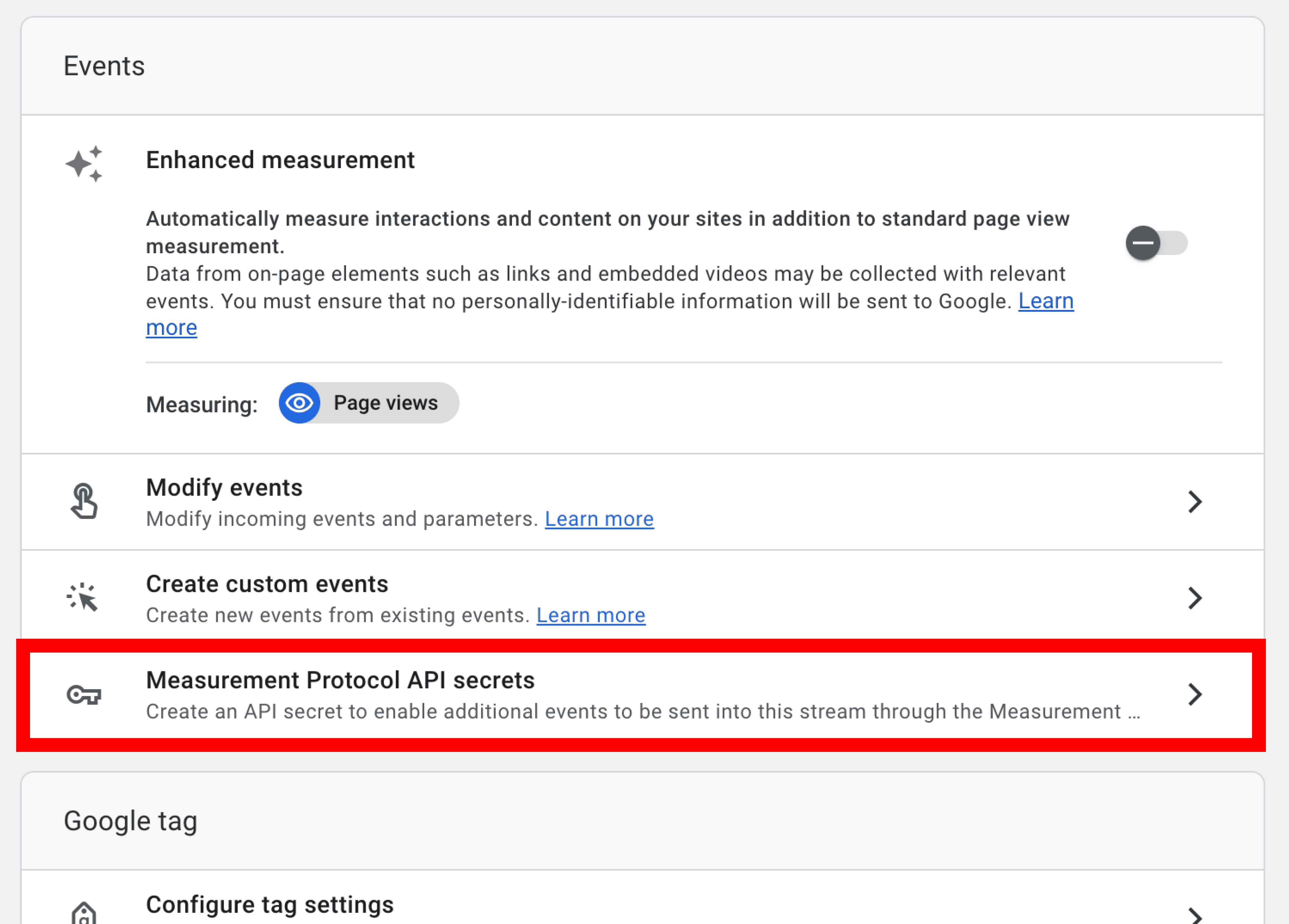 Step 3: Scroll down to find Measurement Protocol API secrets. Click into it.