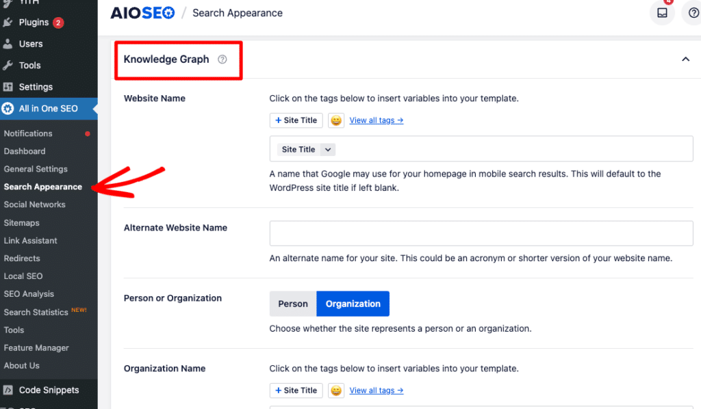 The first schema you can add to your WordPress site is the person or organization schema, depending on which one fits your site. Head to All in One SEO » Search Appearance and scroll down to the Knowledge Graph section. Fill it out as completely as you can.
