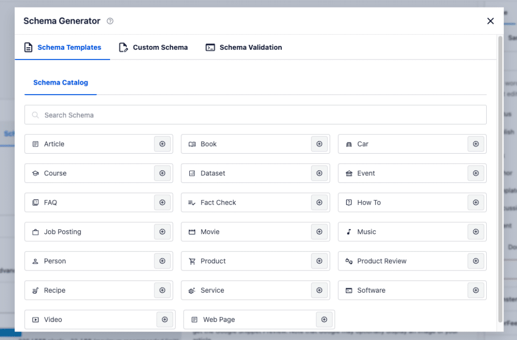 You’ll notice that posts automatically have Article schema set up and pages automatically have the Web Page schema. To add more schema, click the blue Generate Schema button: