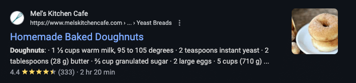 See the rating and bake time below this search result? That’s recipe schema: