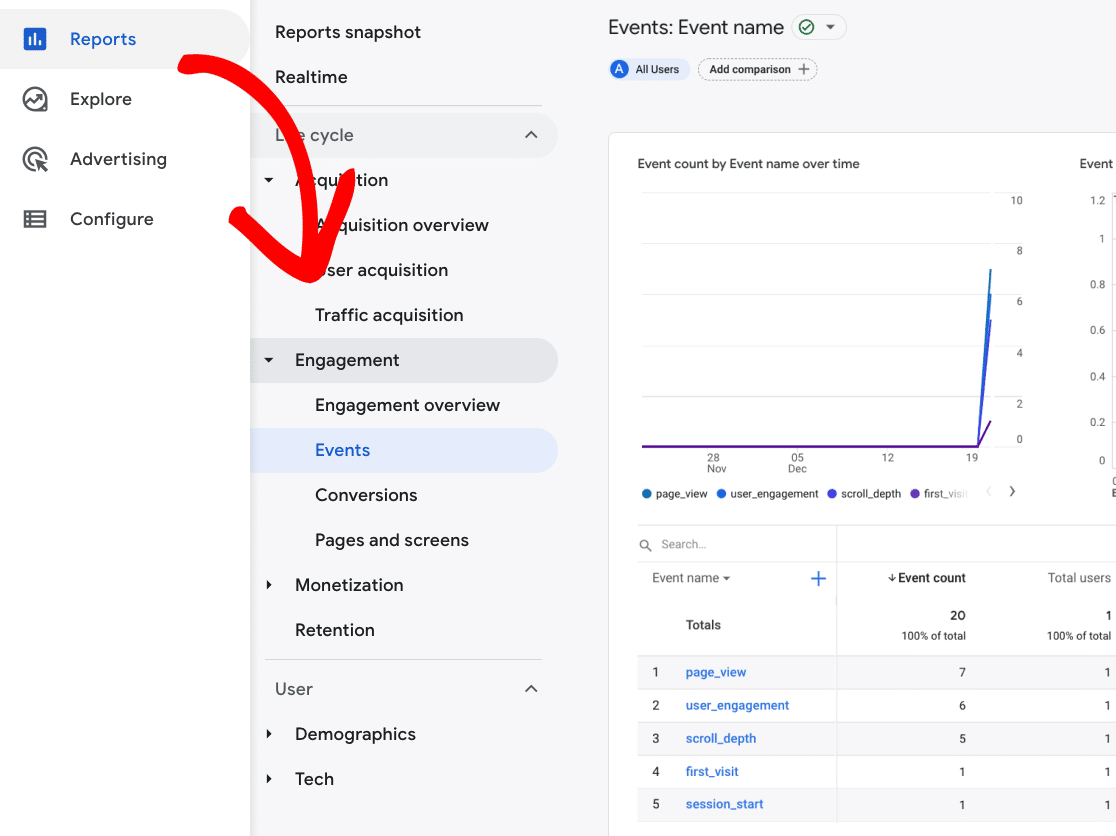 Step 3: Then, go to the Events report at Reports » Life cycle » Engagement » Events: