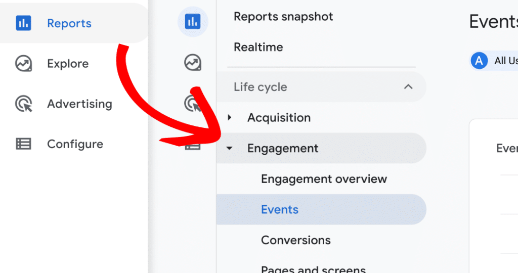 Your video data also appears in Google Analytics as events under Engagement » Events.
