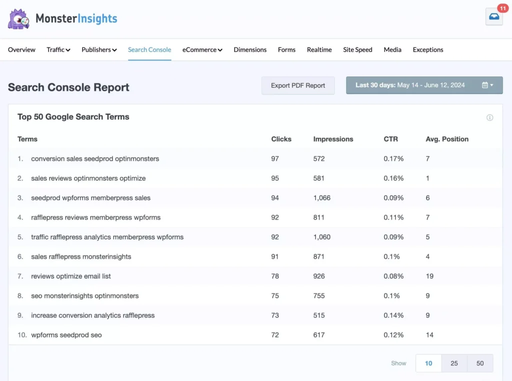 MonsterInsights also integrates with Google Search Console and provides a Google Search Console report in WordPress. This lets you see which keywords drive traffic to your site and how your content performs in search results: