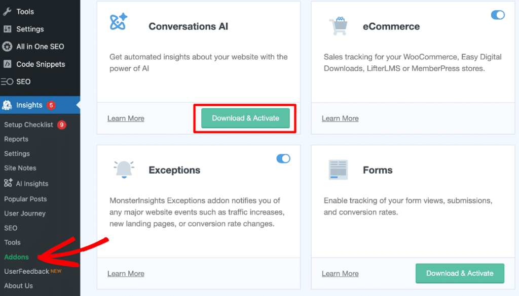 Then, install the Conversations AI addon from your WordPress dashboard by going to Insights » Addons. Find the addon called Conversations AI and click the Download & Activate button: