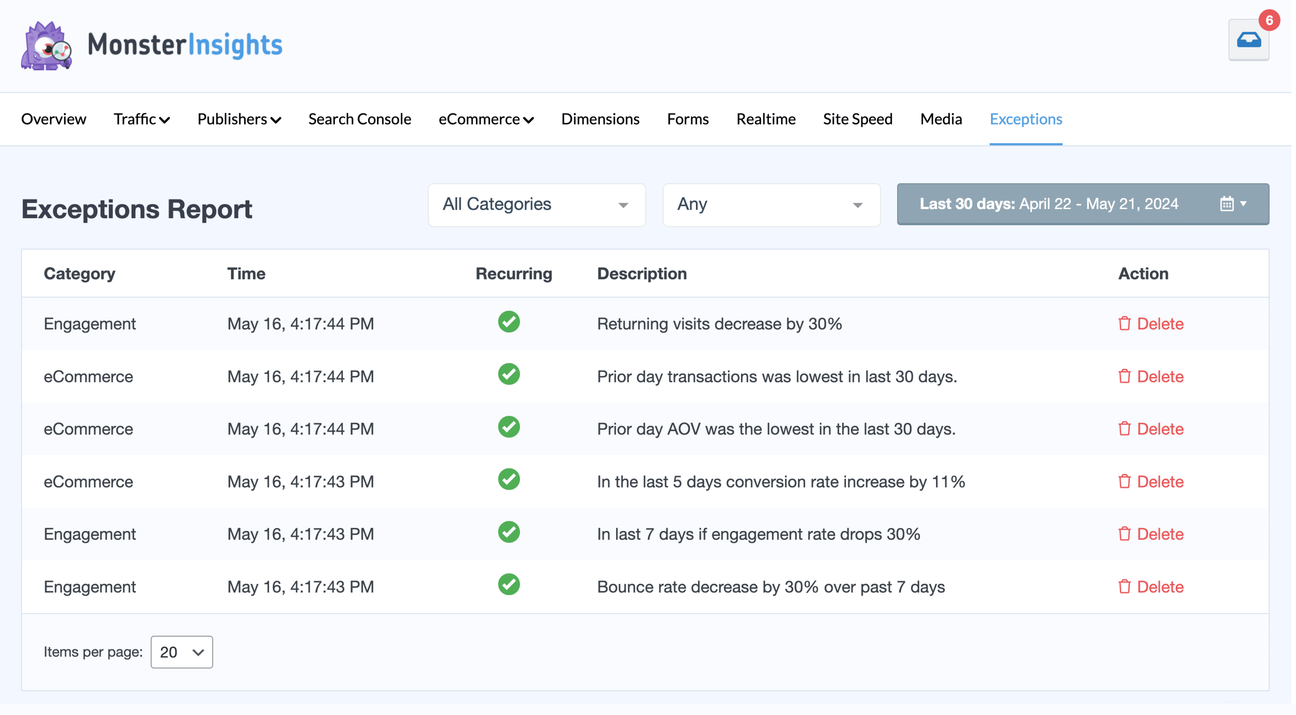 Do you manage a large website, a lot of websites, or just a website where noticing fluctuations right away is really important? Now, MonsterInsights Agency users can use the Exceptions addon to get timely alerts about big fluctuations in traffic and/or conversions: