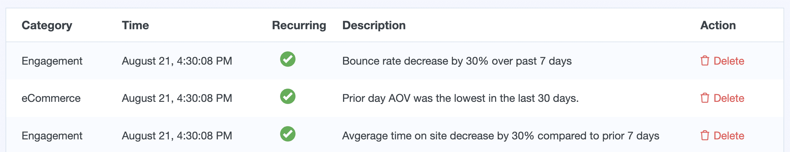 Get AI Insights in case you’re not quite sure where to start yet with your collected analytics. Check in on the randomly generated AI Insights to keep on top of trends and observations of your data made for you.