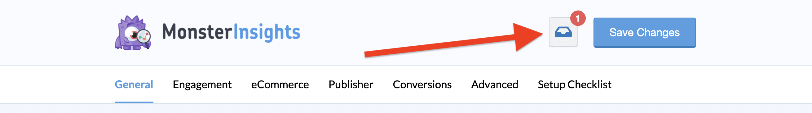 Check notifications by clicking on the notification icon, where you can stay up to date with MonsterInsights, Google Analytics and any changes within your data.