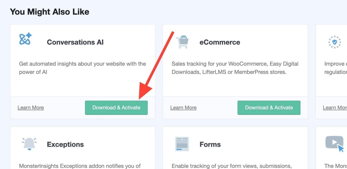 To start, first go to Insights » Addons and activate the Conversations AI addon by clicking on the Download & Activate button.