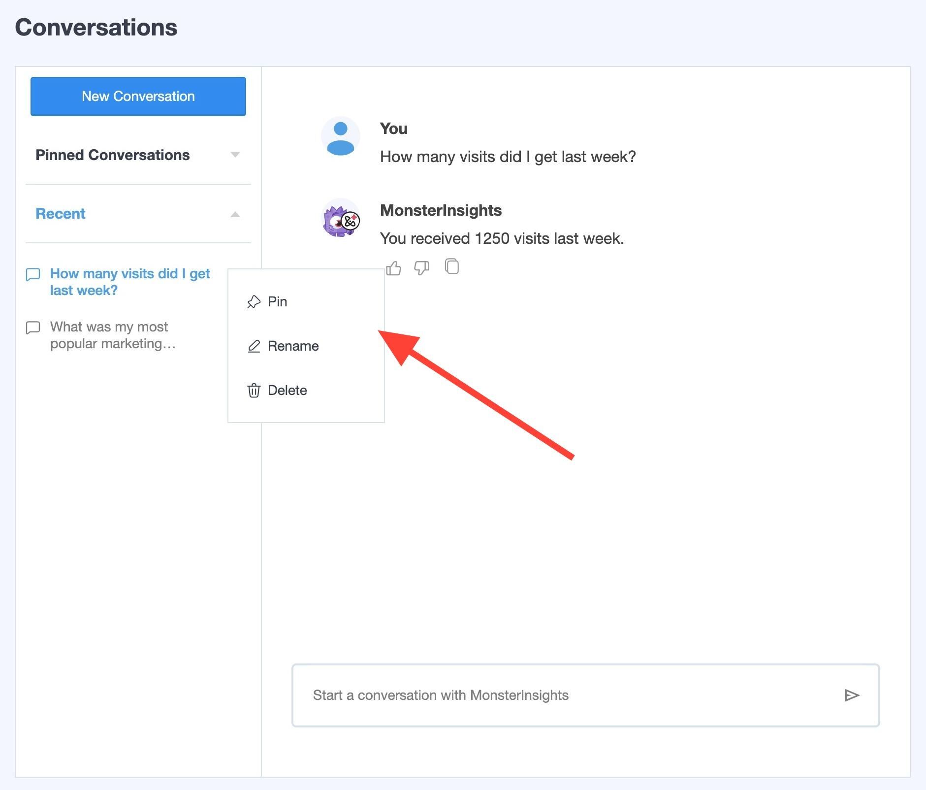 Click into the page Insights » Conversations and start a conversation with MonsterInsights.
