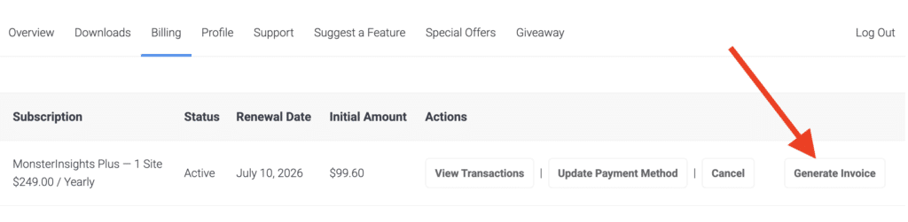 To generate an invoice for your MonsterInsights account, you must have purchased MonsterInsights.