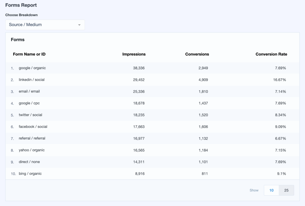 Lastly, you can choose a breakdown of the Forms report by clicking on the following dropdown: