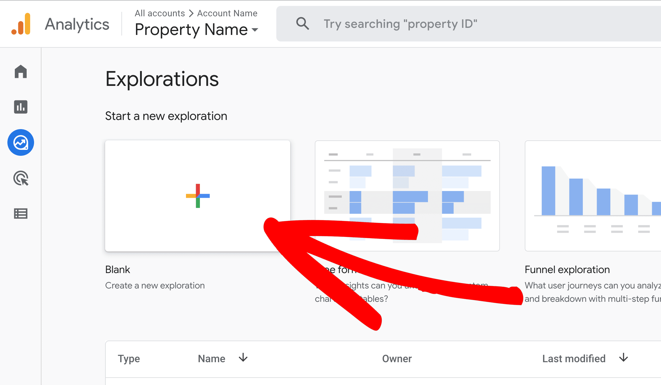 Start by logging into your GA4 account, going to Explore, and creating a blank report.