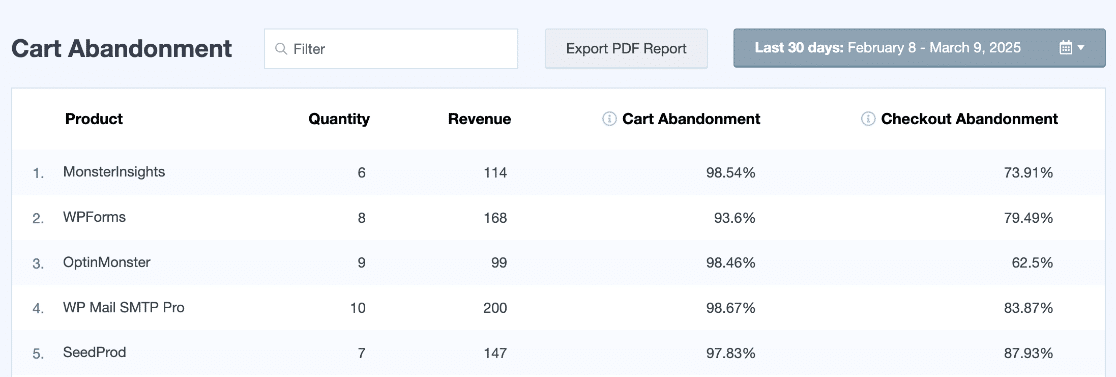 You’ll also get a full Cart Abandonment report. This report has two tables: abandonment by product and abandonment by date. Use it to: