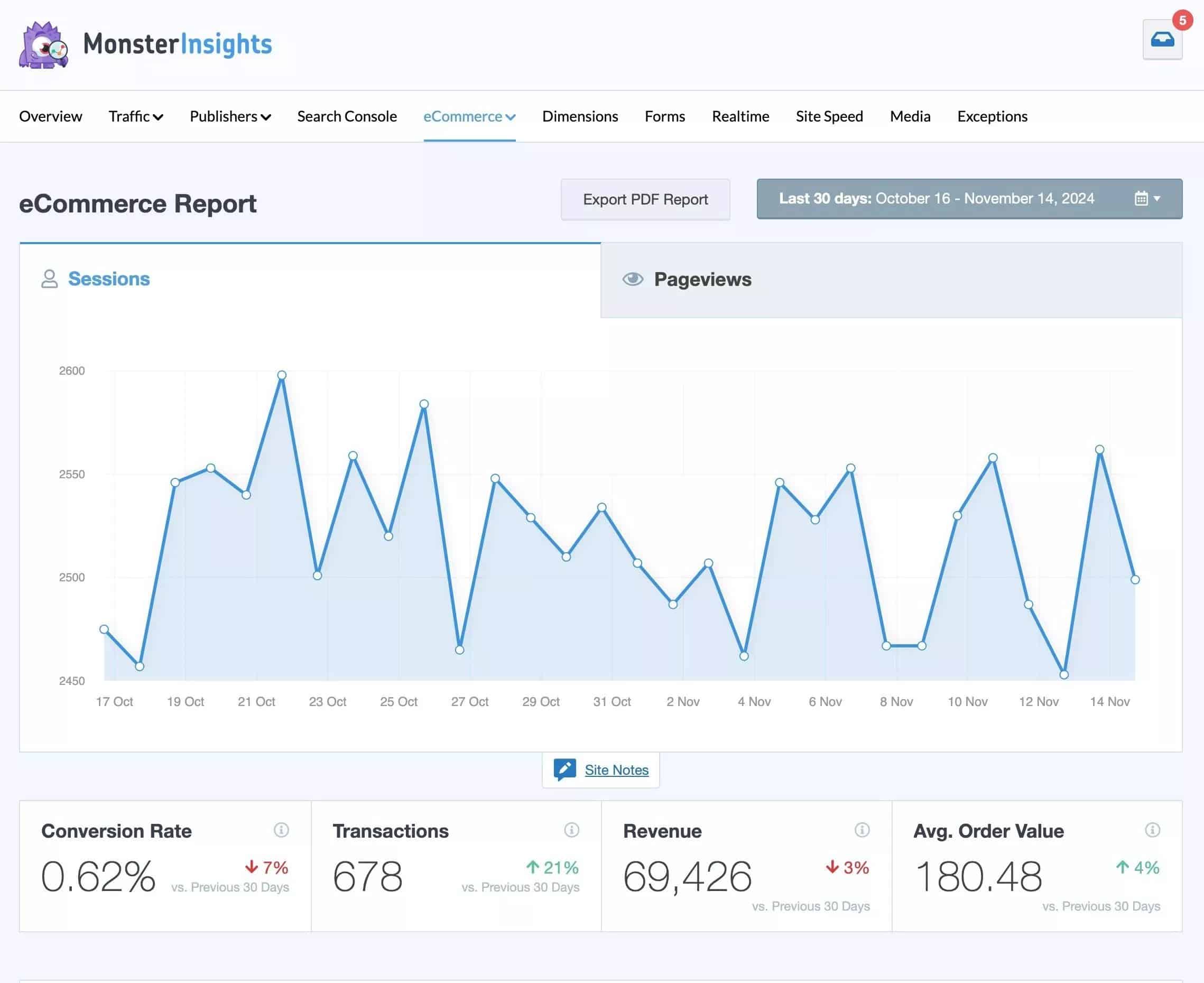 MonsterInsights is the best Google Analytics plugin for WordPress, and it allows you to set up eCommerce tracking (and track your eCommerce metrics in your WordPress dashboard) with just a few clicks.
