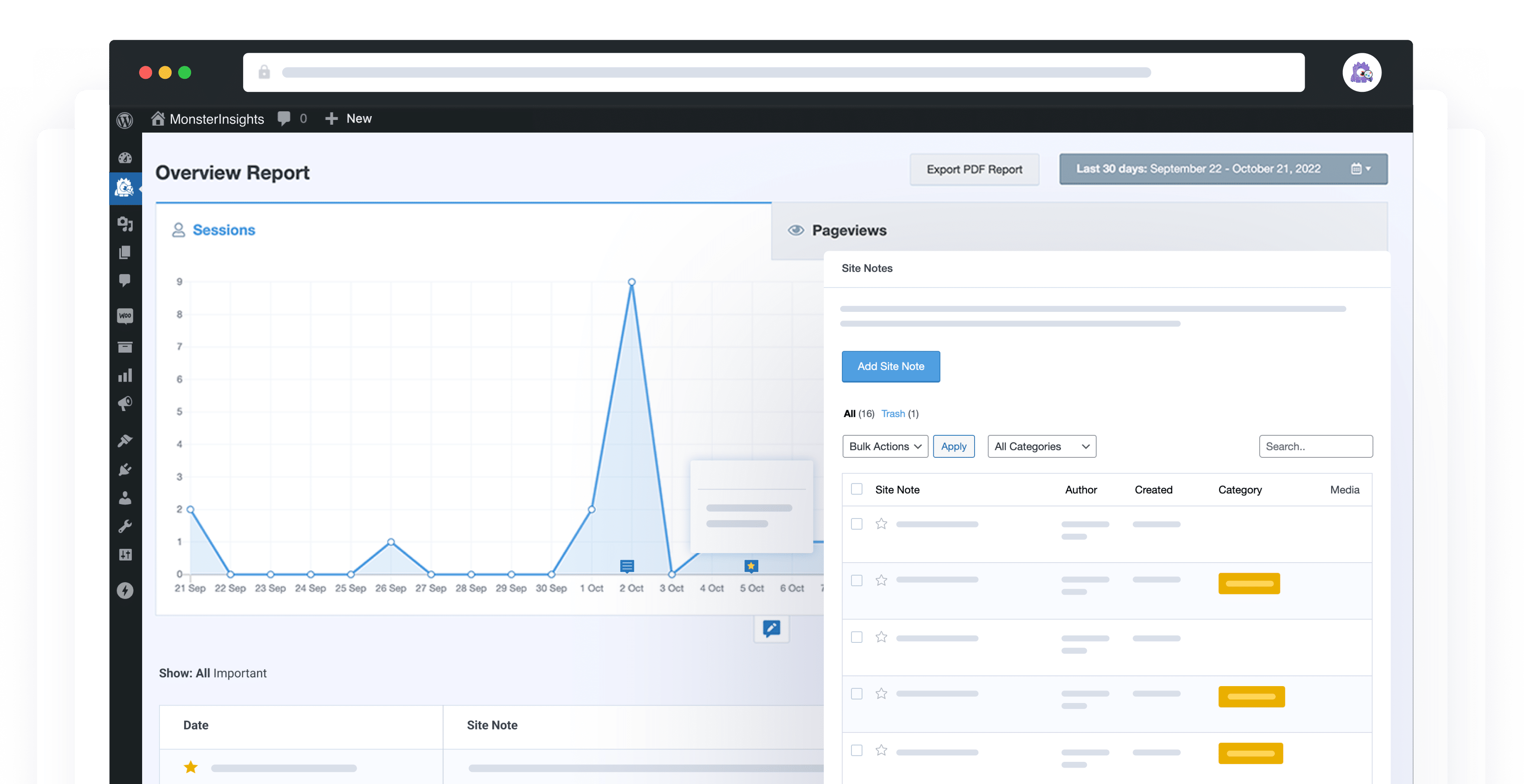 MonsterInsights’ Site Notes makes it easy to stay organized and collaborate with your team. Assign titles, dates, and categories to your notes, and attach media to add more context.