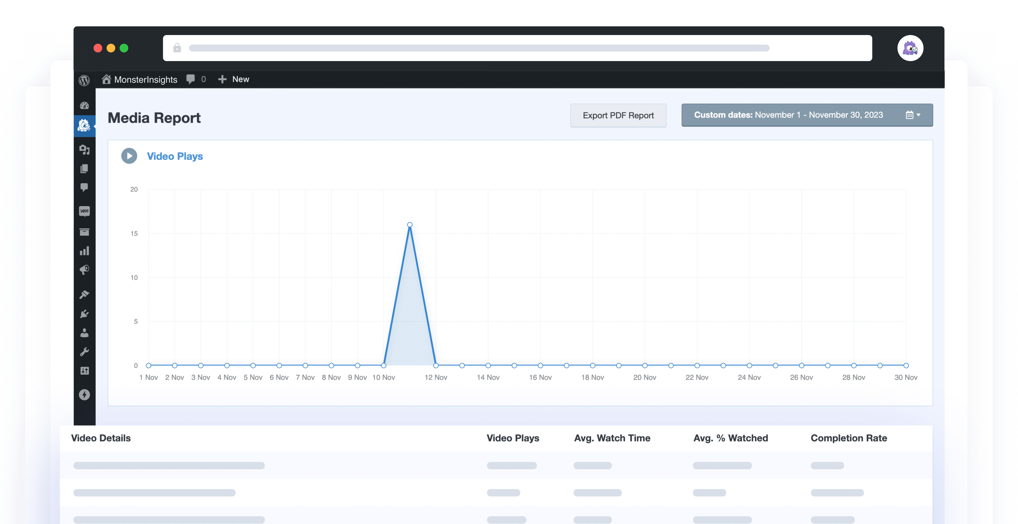 Say goodbye to juggling multiple tools or getting lost in confusing interfaces. With MonsterInsights, all your video metrics are right inside your WordPress dashboard. Our intuitive reports are simple, clear, and available at your fingertips.