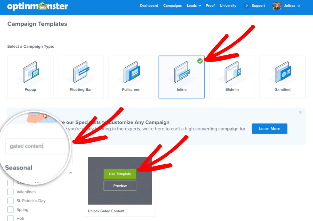Then, choose the Inline Campaign type in OptinMonster and select the Unlock Gated Content template. This template is specifically designed for content locking and comes with pre-built elements that you can easily customize.