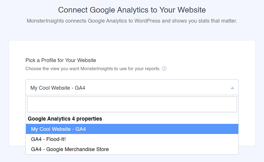After that, you’ll need to pick a profile to complete the connection. If you have multiple websites connected to your Google Analytics account, then you’ll need to choose the right website property here.