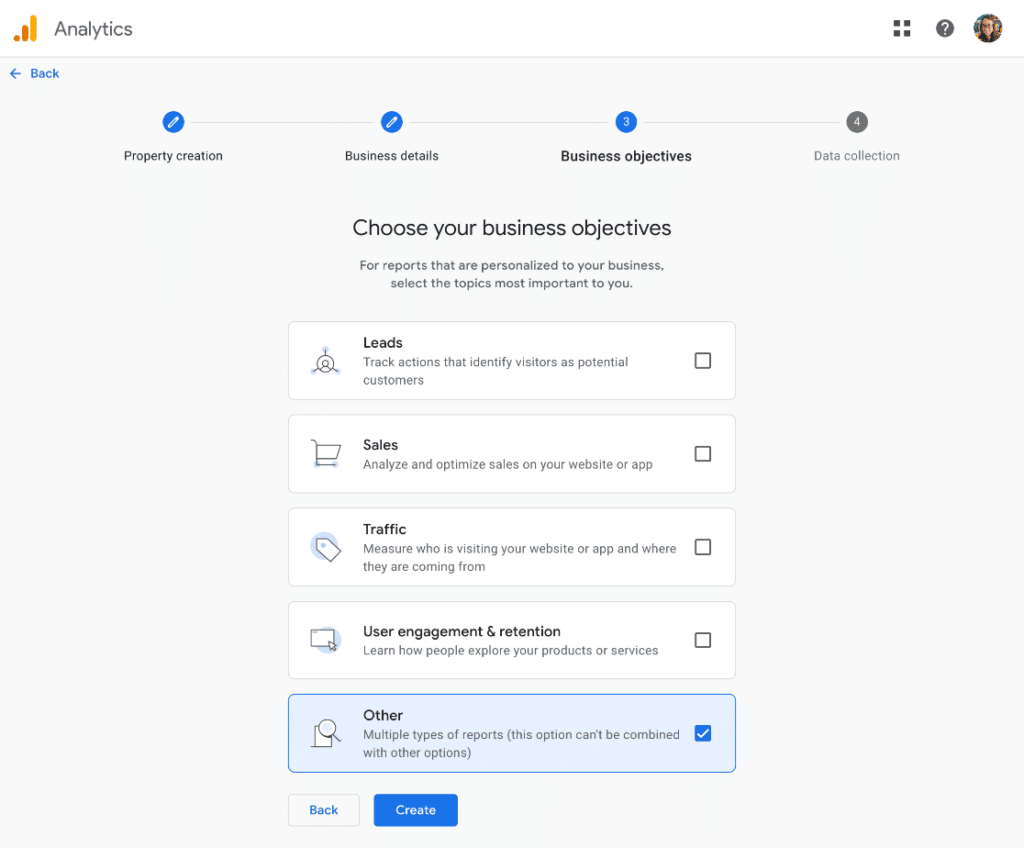 Finally, choose your business objectives. We suggest choosing Other to populate your account with all of the Google Analytics reports.
