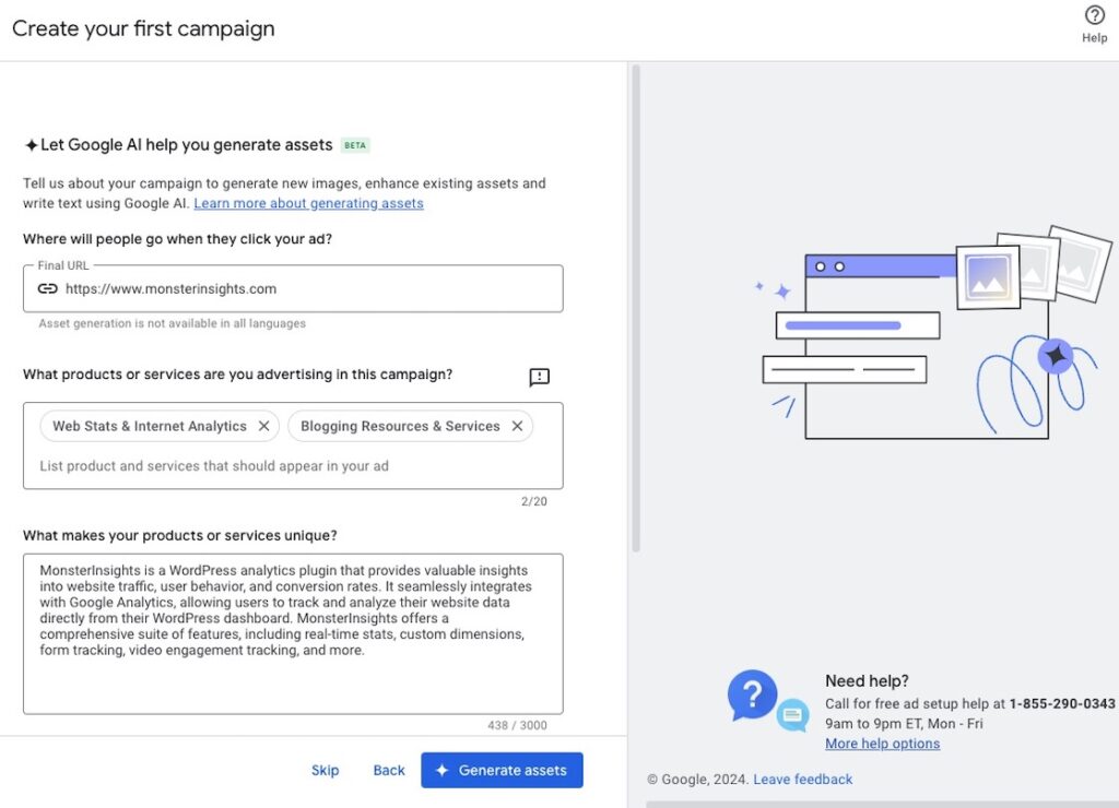 Next, Google will offer to use its AI to help you create your ads. You can absolutely try this if you’d like! For this tutorial, I’ll skip it and show you how to create all of your own assets. So, I’ll click Skip here, but you can click Generate assets if you’d like to give it a go.