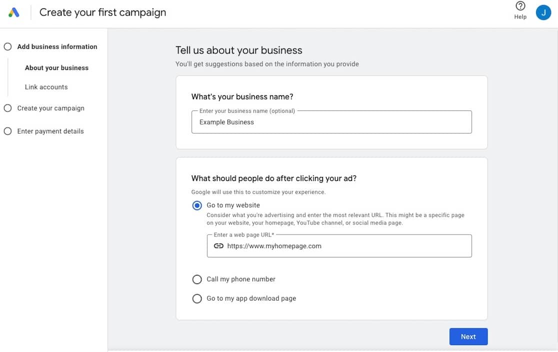 You’ll be guided through adding all of the necessary business information, including your business name and where people should go when they click on your ad. Put the URL there that you want to send your first ad(s) to. Don’t worry, this is something you’ll be able to change later: