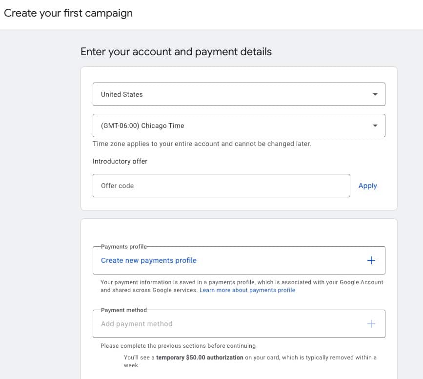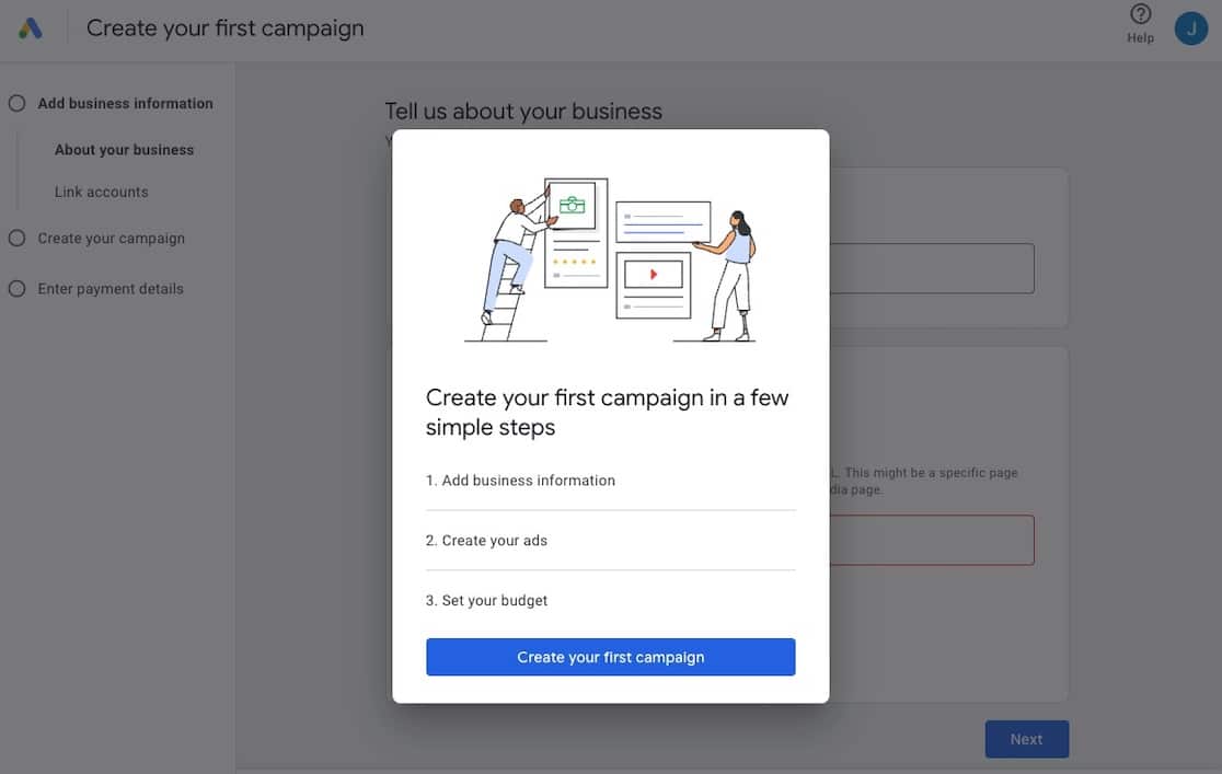 Once you’ve signed in, Google will begin to walk you through creating your first campaign. Go ahead and click Create your first campaign: