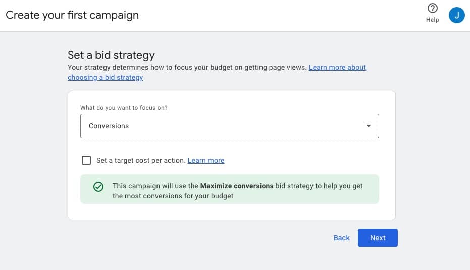 On the next screen, you’ll choose your bid strategy. This is how you want Google to decide how it chooses to run your campaign. Based on the goal I set, I can choose conversions or conversion value: