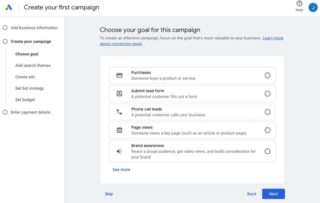 The first thing you’ll do here is select a goal! Note that you’ll be able to create other campaigns later with other goals. For now, pick just one to get started with: