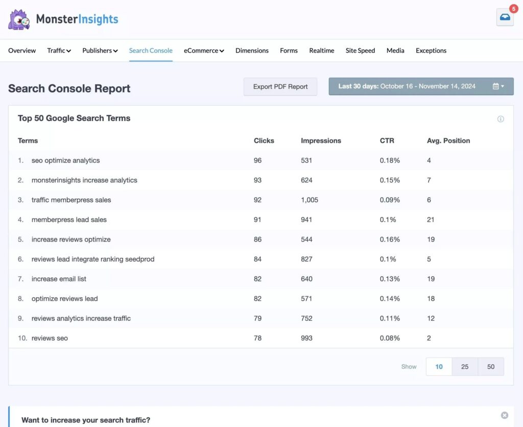 MonsterInsights also simplifies this process by displaying your top 50 search terms directly in your WordPress dashboard in the Search Console report. This report shows:
