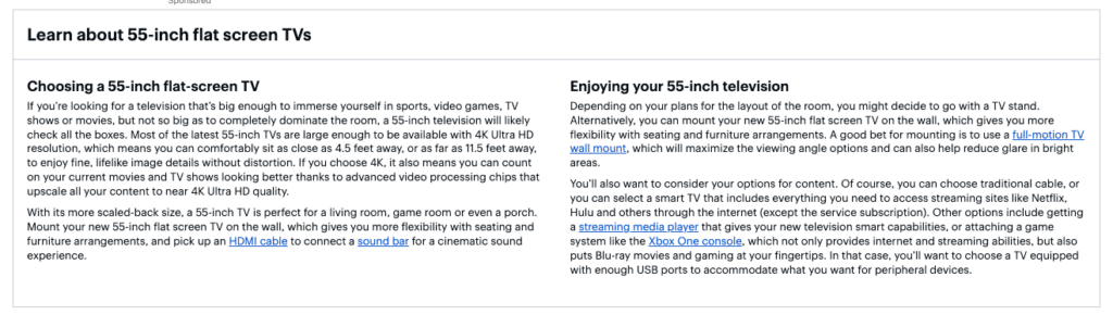 Many successful eCommerce stores include detailed content on their category pages. For example, Best Buy adds comprehensive buying guides to their television category pages, helping shoppers make informed decisions while incorporating valuable keywords.