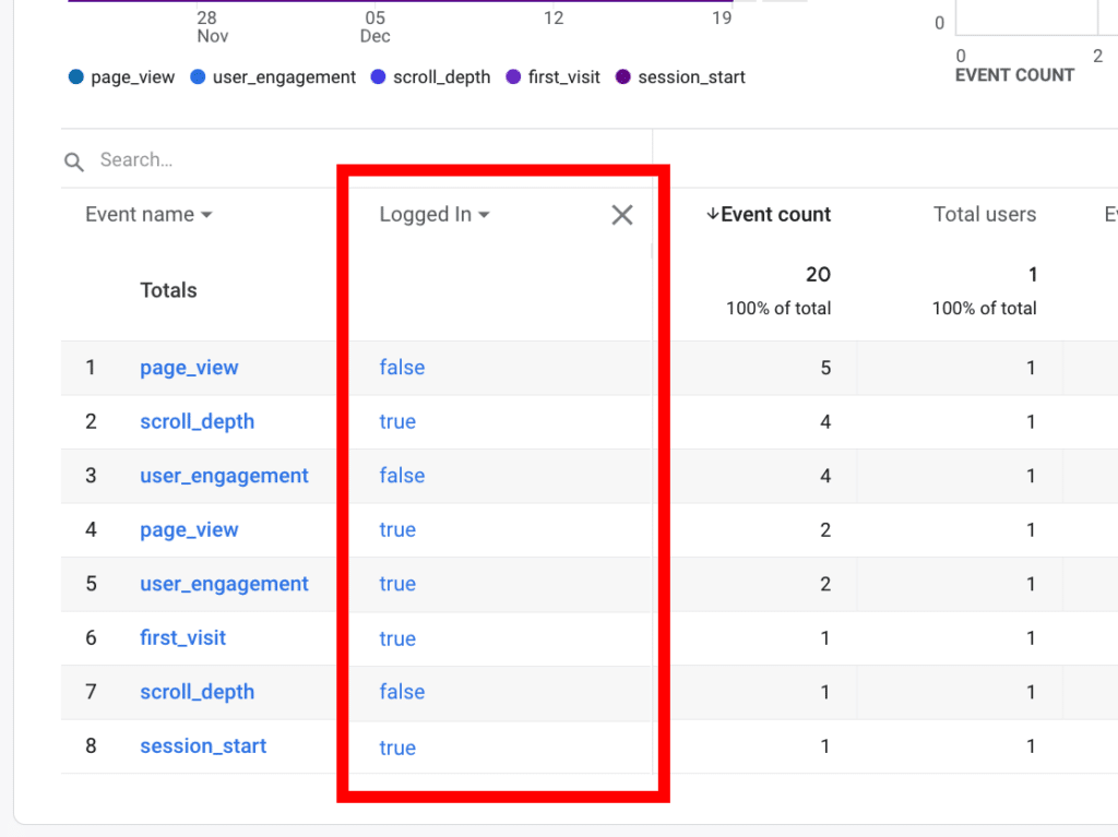 MonsterInsights also creates the dimension inside your GA4 account, so you can add it to just about any report to break down your users into logged-in vs. logged-out segments:
