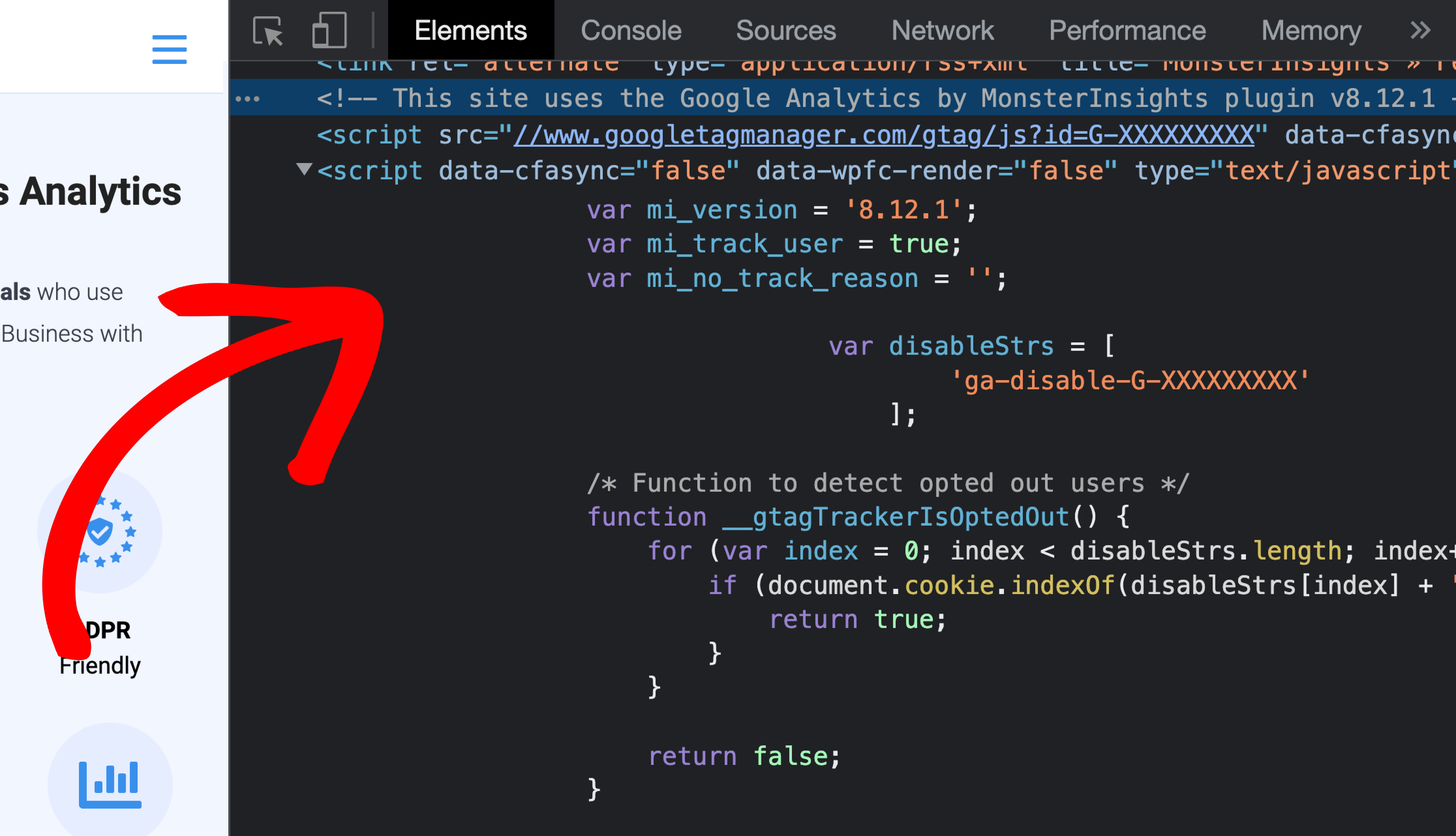 While viewing your website’s source, search for “MonsterInsights” code: