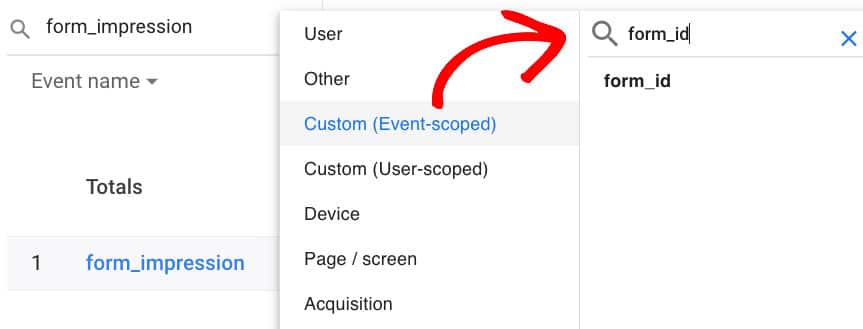 You’ll find the form_id dimension under the Custom (Event-scoped) section of the popup menu that appears after clicking on the plus (+) icon. Click on form_id to add it as a column to your report.