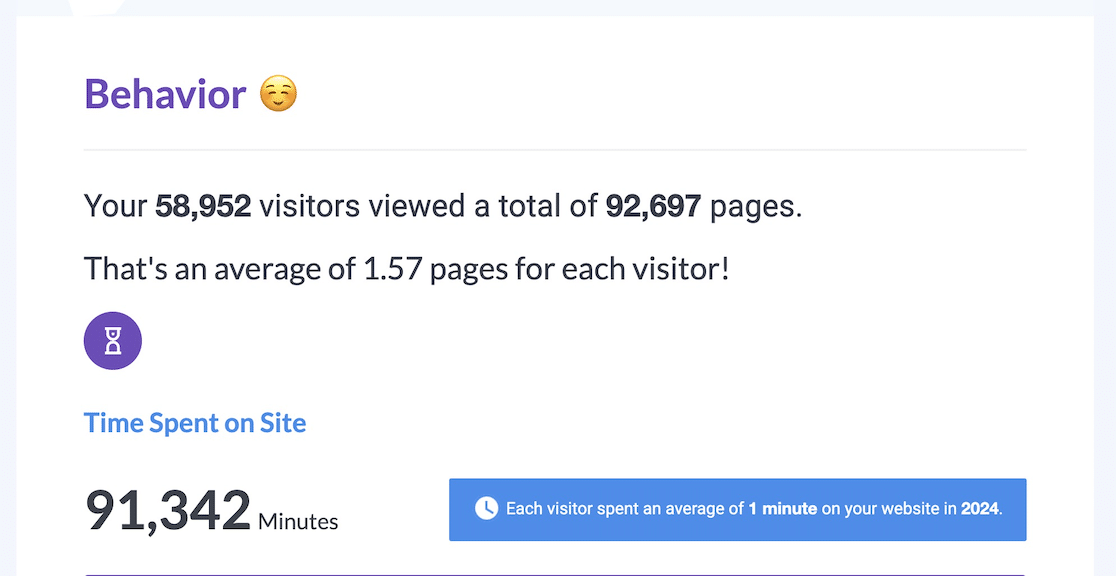 Check out the overall behavior numbers at the beginning, then scroll down for a list of your most-viewed pages in 2024.
