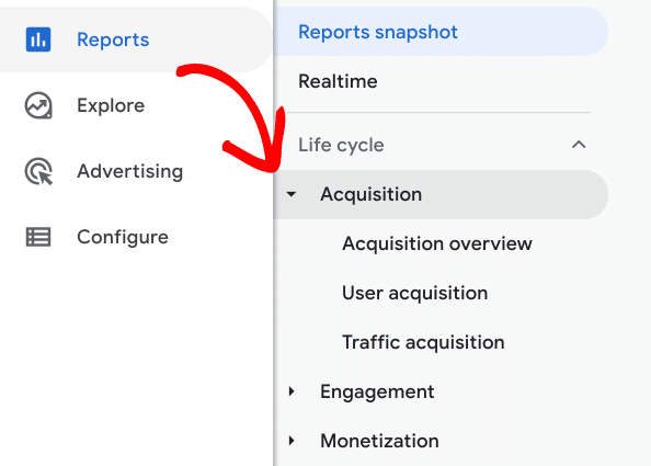 To find your UTM data in your Google Analytics property, navigate to analytics.google.com » Reports » Acquisition (under Life cycle).