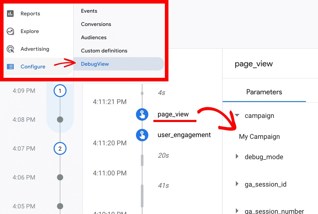 In the DebugView report, you view each campaign UTM parameter for a page_view event in real-time.
