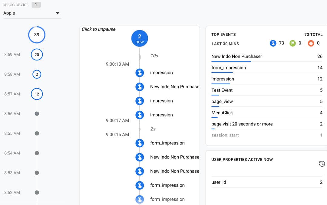 You’ll also get a report of the top events for the last 30 minutes and the user properties for the device or browser that’s on debug mode.