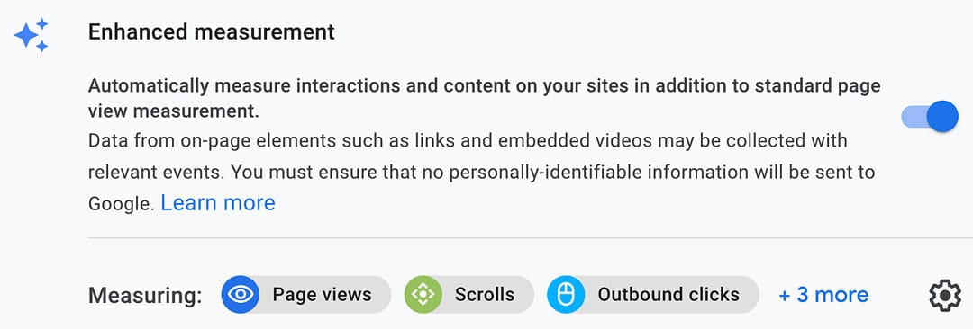 GA4 allows you to turn on enhanced measurement to get an extra set of automatically collected events. You don’t need to write code to get these extra events. But, you’ll need to enable the Enhanced measurement setting in your Data Stream.