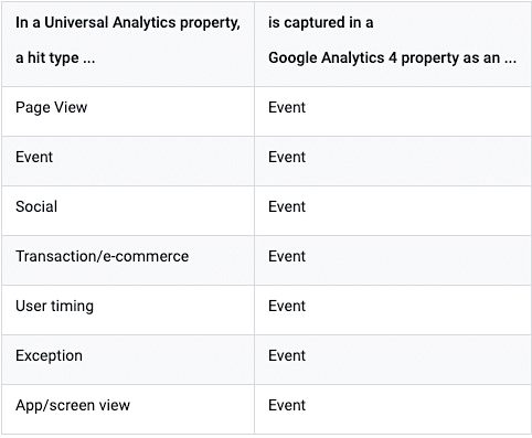 The table below shows how UA hit types are all mapped to GA4 events, courtesy of Google:
