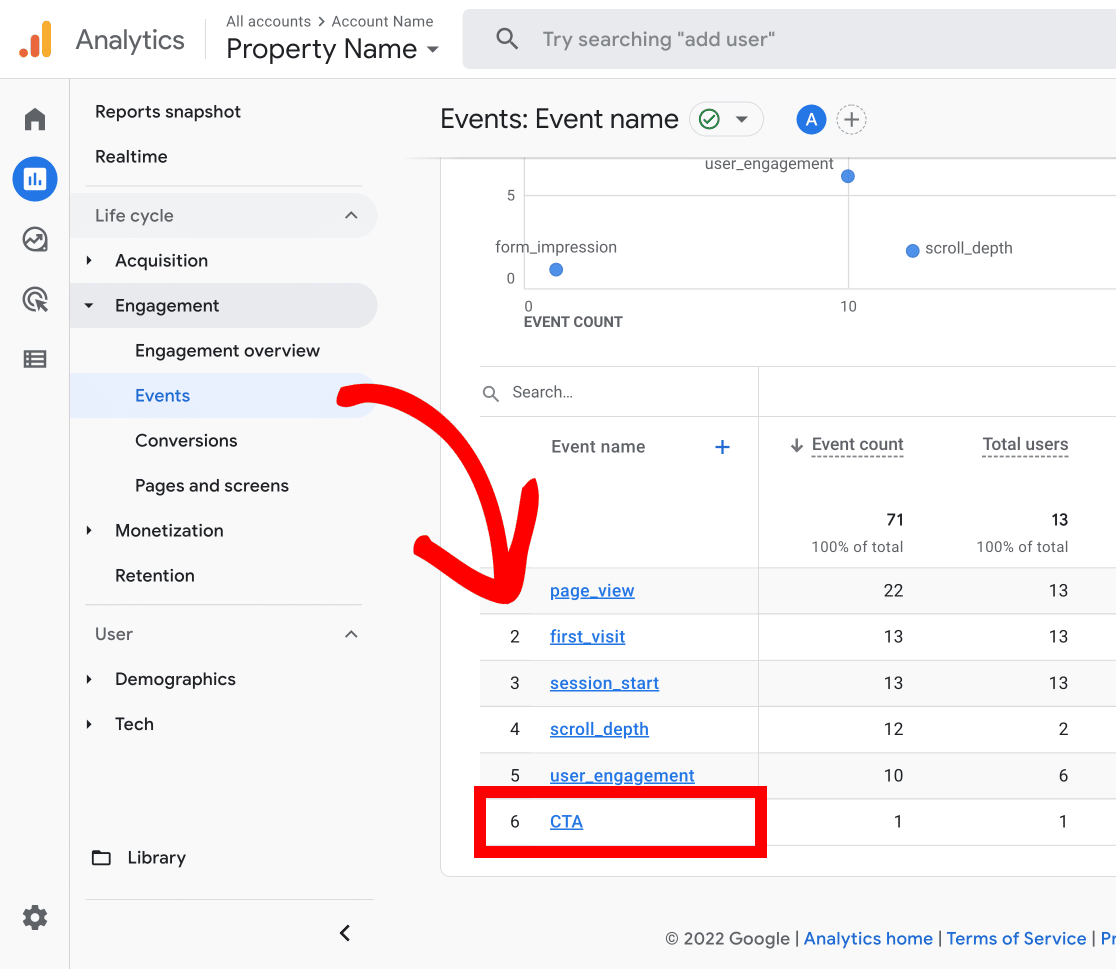 Step 2: Once you’ve located your custom event, you can view columns of data such as Event count and Total users.