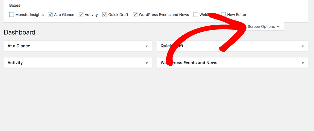 Step 5: Close the Dashboard Widgets Boxes Screen by clicking screen options again: