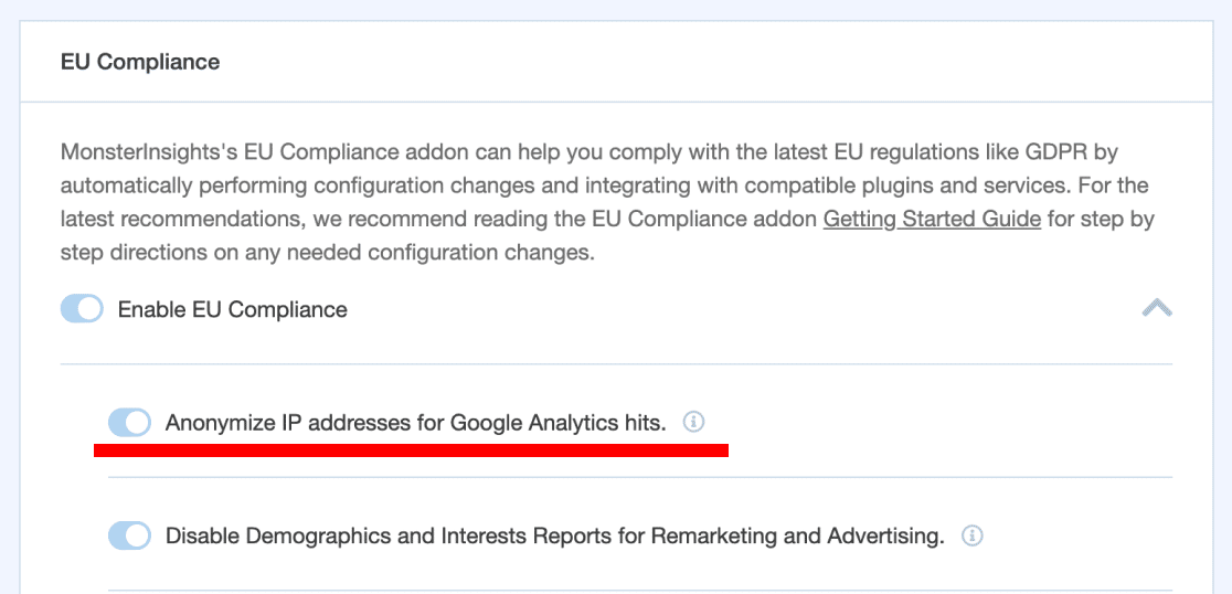 If you are a MonsterInsights Plus user or higher, you can install and activate the EU Compliance Addon. When this addon is active, it will automatically turn the Anonymize IP Addresses option on.