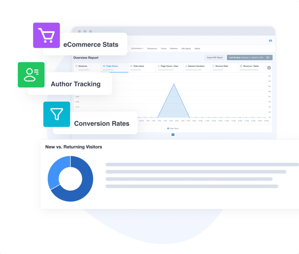 Take full control of your analytics with a dashboard designed to fit your business. MonsterInsights lets you activate advanced tracking features like eCommerce stats, author tracking, conversion rates, and more with just a few clicks – showing only the metrics that matter most to you.