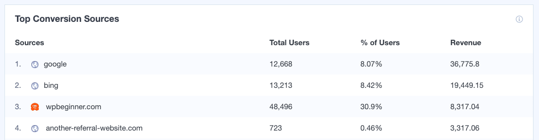As you scroll down the page, you’ll see your store’s top referral conversion sources. These are traffic sources that send customers to your website.