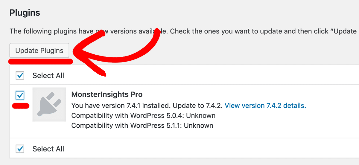On this page, you will see all of the items that your site has identified as needing updates. Scroll down to the Plugins section and check the box next to the MonsterInsights plugins. Then click Update Plugins.
