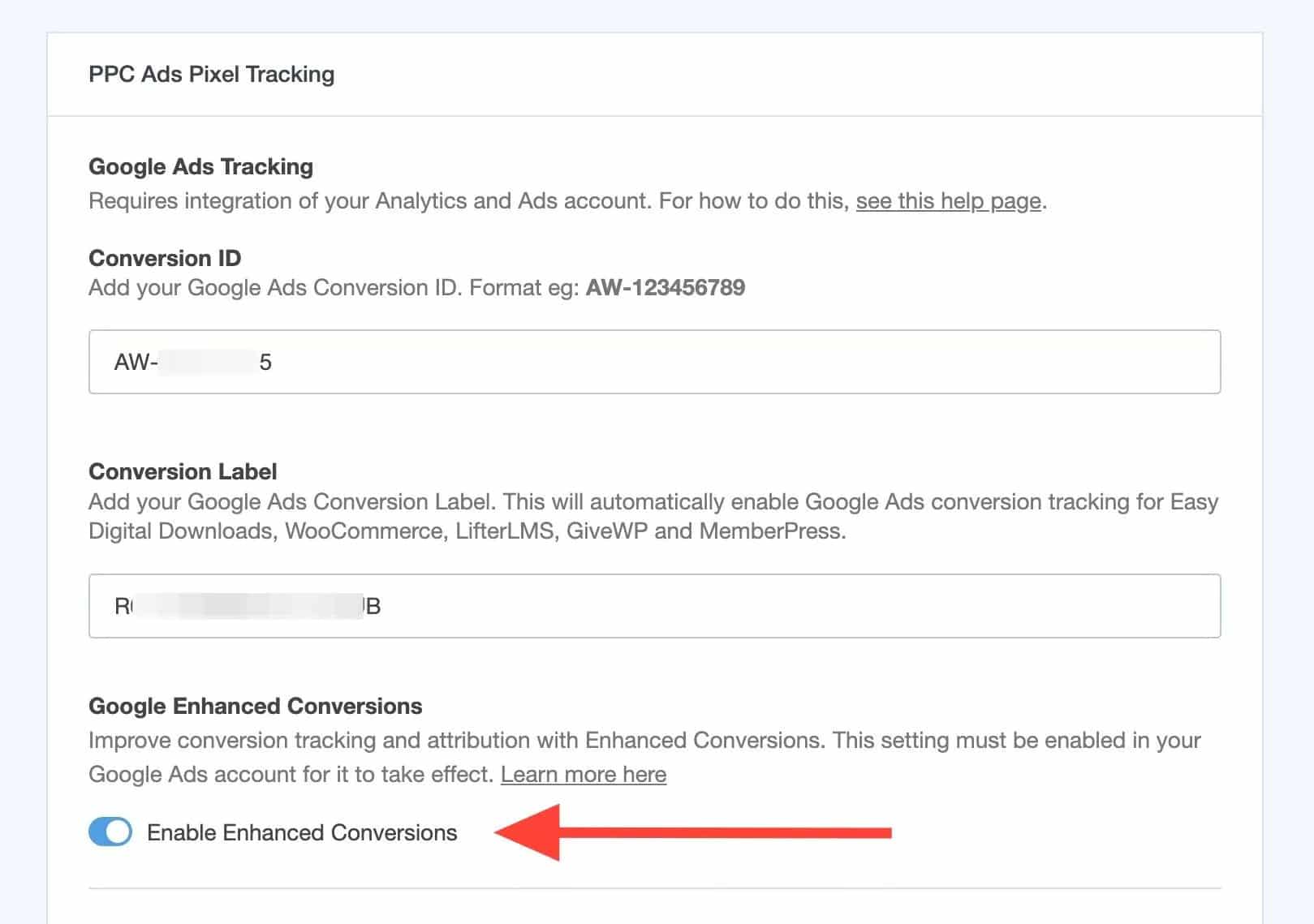 Switch on the Enable Enhanced Conversion toggle.