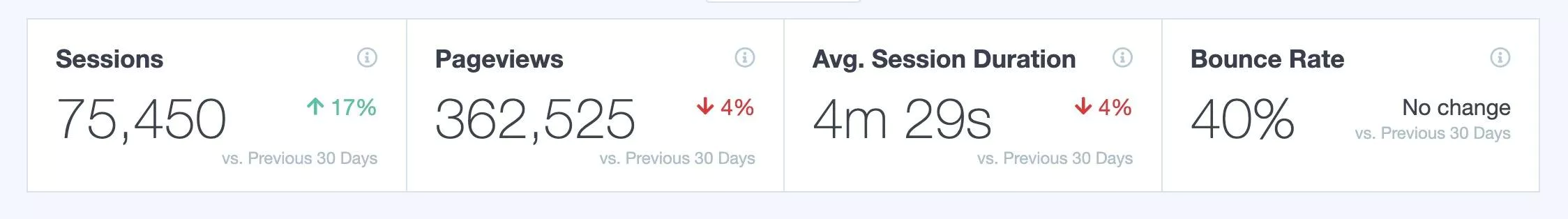 By default, in MonsterInsights’s overview report you’ll see a month-over-month percentage, indicating an overall positive or negative trend of your website based on the number of sessions, page views, average session duration and bounce rate.