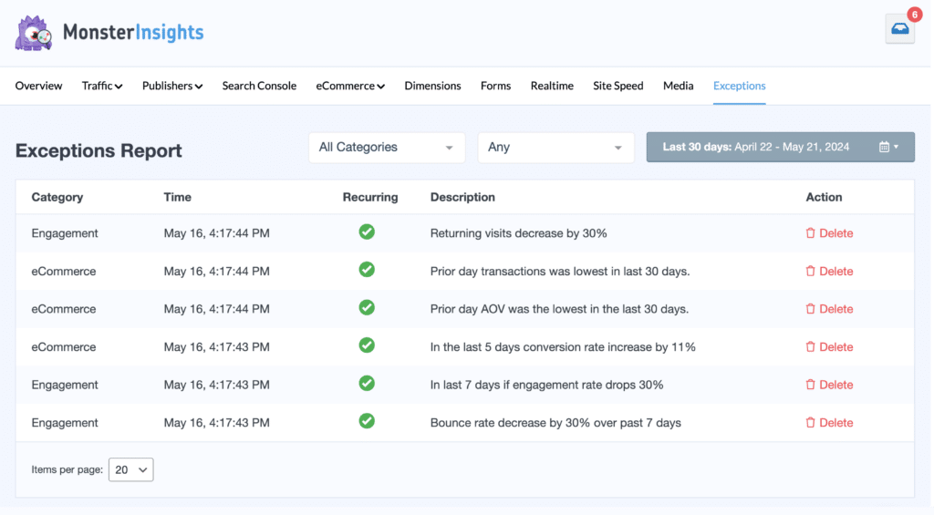The MonsterInsights Exceptions tracking and reporting feature is designed to help you effortlessly monitor sudden changes in metrics such as conversion rates, traffic, transactions, engagement, and bounce rates, allowing you to quickly address potential issues.