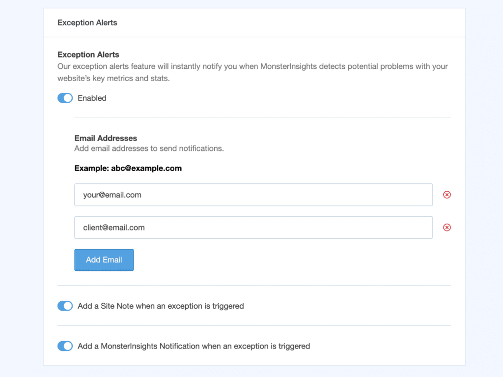 With the MonsterInsights Exceptions addon, you can automatically be notified of these changes through email alerts, site notes and dashboard notifications.