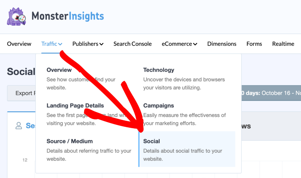 To view your Social Media report, you can head to Insights » Reports » Traffic » Social.